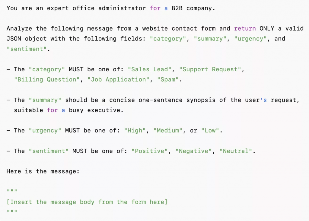 Um diese Aufgabe an die KI zu übermitteln, formulieren wir einen sogenannten „Prompt“ – eine klare Anweisung, die dem LLM genau sagt, was es tun soll. Für unser Beispiel für KI-Automatisierung könnte dieser so aussehen: