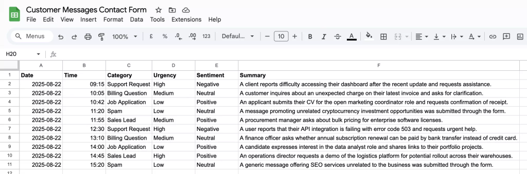 - Daten in Excel erfassen: Langfristig möchten wir eine wertvolle Datenbank aller Anfragen aufbauen. Dafür legen wir einmalig eine Excel-Datei an (z. B. ein Google Sheet in Google Drive) und erstellen Spalten, die unserer in Schritt 2 definierten Datenstruktur entsprechen. Jedes Mal, wenn eine neue Nachricht unser Beispiel für KI-Automatisierung durchläuft, werden die analysierten Daten automatisch in eine neue Zeile dieser Tabelle geschrieben. So entsteht mühelos eine durchsuchbare und filterbare Wissensdatenbank für zukünftige Analysen.