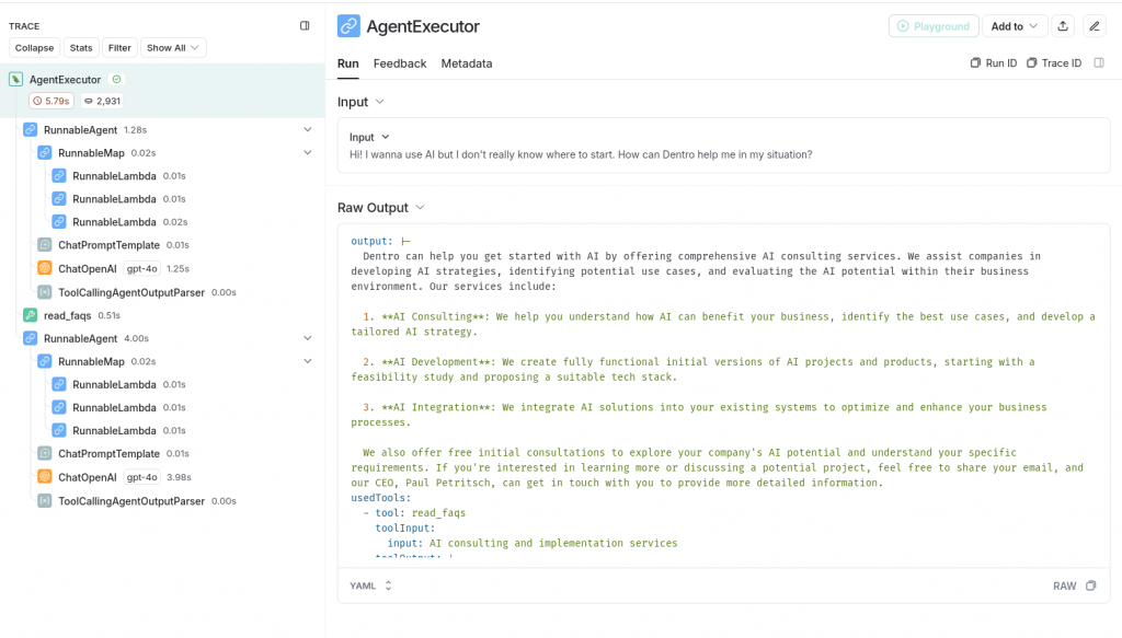 Bei Dentro verwenden wir oft die eingebaute Fallback-Funktionalität von Langchain. Sie können aber auch einfach eigenen Code schreiben, um fehlgeschlagene Anfragen anständig zu behandeln.