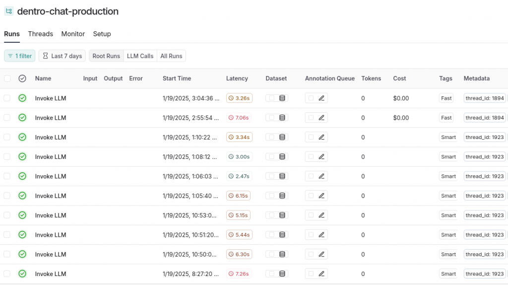 Gerade heute haben wir eine Situation erlebt, in der OpenAI unser Guthaben nicht automatisch aufgestockt hat. Dank unserer Überwachungseinrichtung in LangSmith haben wir den Anstieg der Fehler in unserer DentroChat-Anwendung schnell erkannt und konnten das Problem sofort beheben.