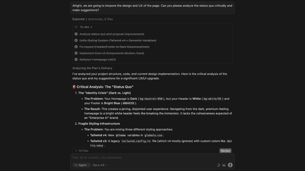 Once both we and the AI have the vision locked in, we start with one main page. We let the AI create a content structure first. Then we let it design — no functionality yet, only visual appearance. This first page establishes the core components: fonts, buttons, color system, spacing. These elements carry across all subsequent page, so we need to nail them here before we move on.